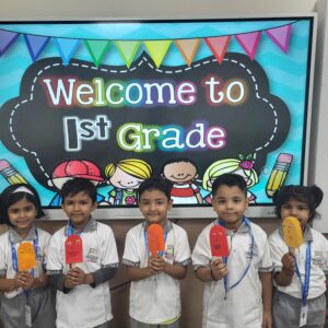 A Welcome Card Activity was organised for the students of Class 1 on 1st April 2026, marking their very first day of school in Class 1. The young learners enthusiastically created and decorated their own welcome cards, expressing creativity and joy. The activity helped them feel comfortable, encouraged self-expression, and made their first day a memorable and exciting experience.