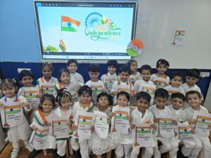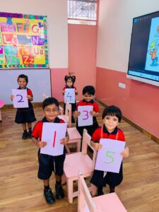 To strengthen the skill of identifying numbers, a fun-filled game was organised in the class. The chairs were placed in such a way that children have the space to run around, and each chair has a number placed on it. As the music played, children were supposed to move around the chairs with excitement. As the music stopped, each child quickly sat on a chair and was asked to identify the number on it. This activity not only helped reinforce numbers but also created an engaging and joyful learning environment.