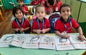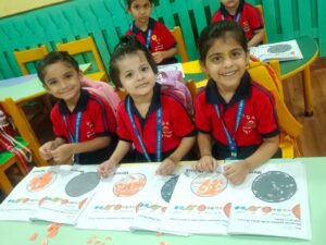 Children were introduced to the different planets through hands-on activities. They enjoyed colouring the planet Earth, which helped them recognize its shape and beauty. For Venus, they did a tearing and pasting activity using orange paper. Such engaging activities not only made the concept of planets more interesting but also helped the children explore knowledge playfully.