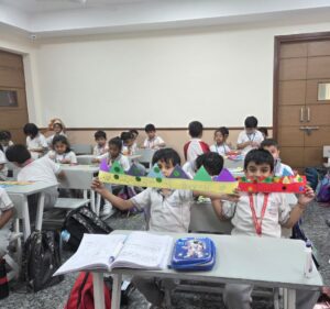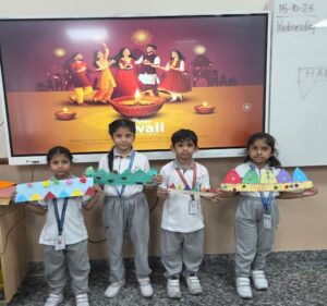Toran Designing Activity was organized for the students of class I on 15th October 2025.The students crafted colorful torans by using colourful ribbons, buttons and mirrors.This hands-on activity allowed the children to express their creativity while learning about the significance of Diwali, the festival of lights—and the tradition of decorating homes to welcome prosperity and joy.The classroom was filled with excitement as the students proudly displayed their vibrant torans.